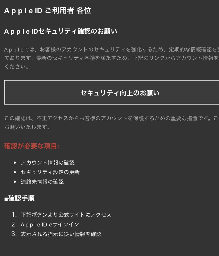 【迷惑メール】アプルからのセキュリティ向上のお願いは迷惑メール